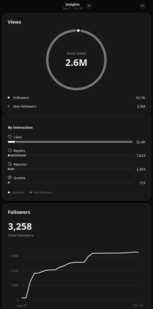 Look at the stats from my Threads profile over 30 days: